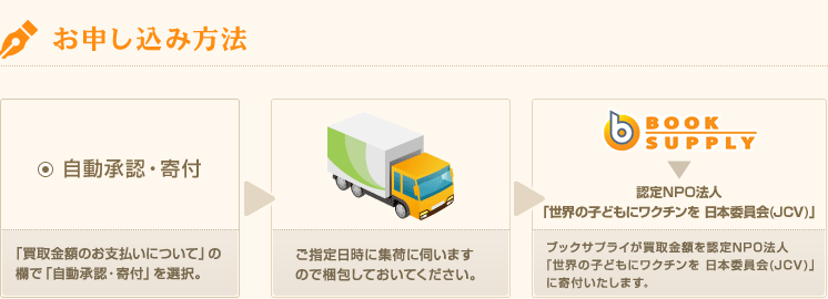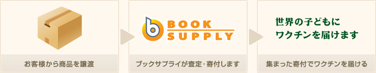 駅、売店、書店、公共の場所にて古本の寄付を受付る事業を展開。集まった古本はブックサプライに発送され、査定し後に買取額をNPO法人に寄付いたします。専用ボックスやPOPを無償で提供しておりますのでお気軽にご参加いただけます。企業様のCSR活動にお役立てください。